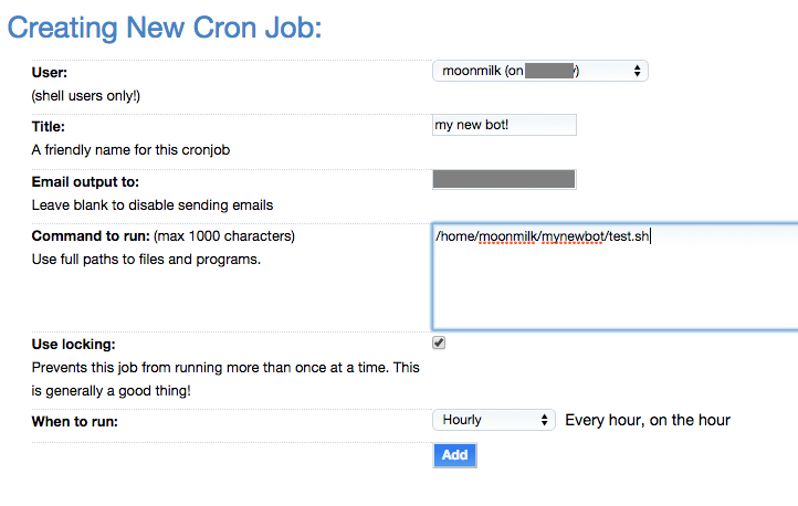 To test your script, you'll probably want to run it from the dreamhost shell, like in my transcript below, but later you'll want to make it run autonomously, probably from a scheduled cron job. Issues: