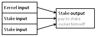 The first one is the coin-age proof-of-burn transaction that I'll abbreviate as the burn transaction. This transaction is quite similar to the coinstake transaction except that it doesn't handle the monetary creation, and as a result the output amount equals the sum of all inputs, like in any standard transaction. This transaction has nothing special, it is just a transaction from a stake holder to himself that is made to reset the age of the stake, ie to burn the coin-age.