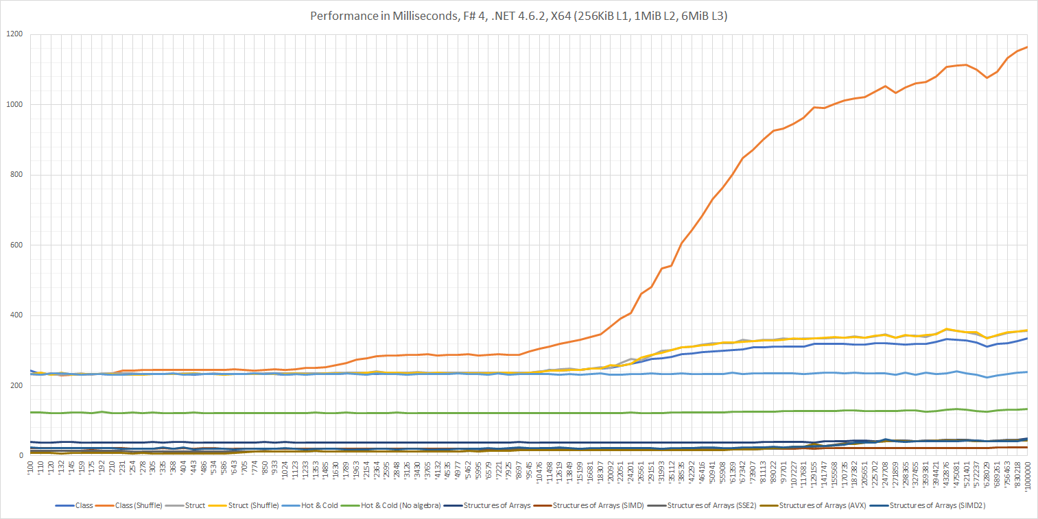 Structures of Arrays (both variants) does the best. As Hot & Cold doesn't degrade due to data starvation it sholdn't be because of more efficient use bandwidth. Instead, it's mainly because the way the code is written we avoid a method call for each particle. When we are calling a method we first marshalls the input arguments and then the method unmarshalls them. As the verlet computation is quite cheap the method call itself is taking some time.