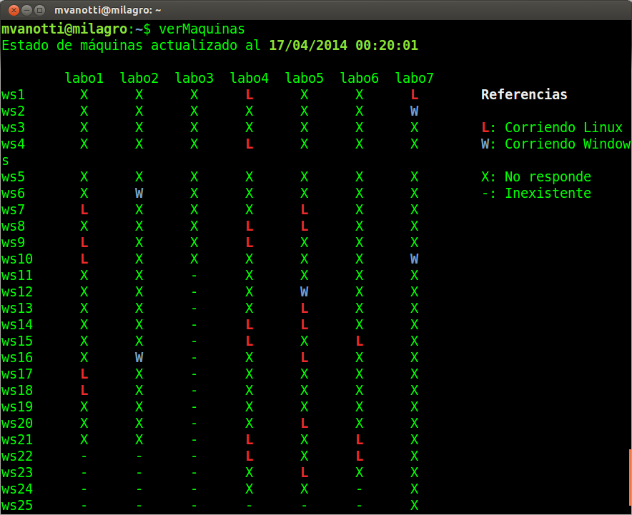 Ahora que estamos adentro, tenemos una terminal igual que antes, salvo que todo lo que ejecutemos se va a ejecutar en la pc milagro (en la facu). Debemos conectarnos por ssh a alguno de los labos. Como saben, no siempre todas las pcs de todos los labos se encuentran prendidas. Para ver qué pcs están prendidas, podemos ejecutar: verMaquinas