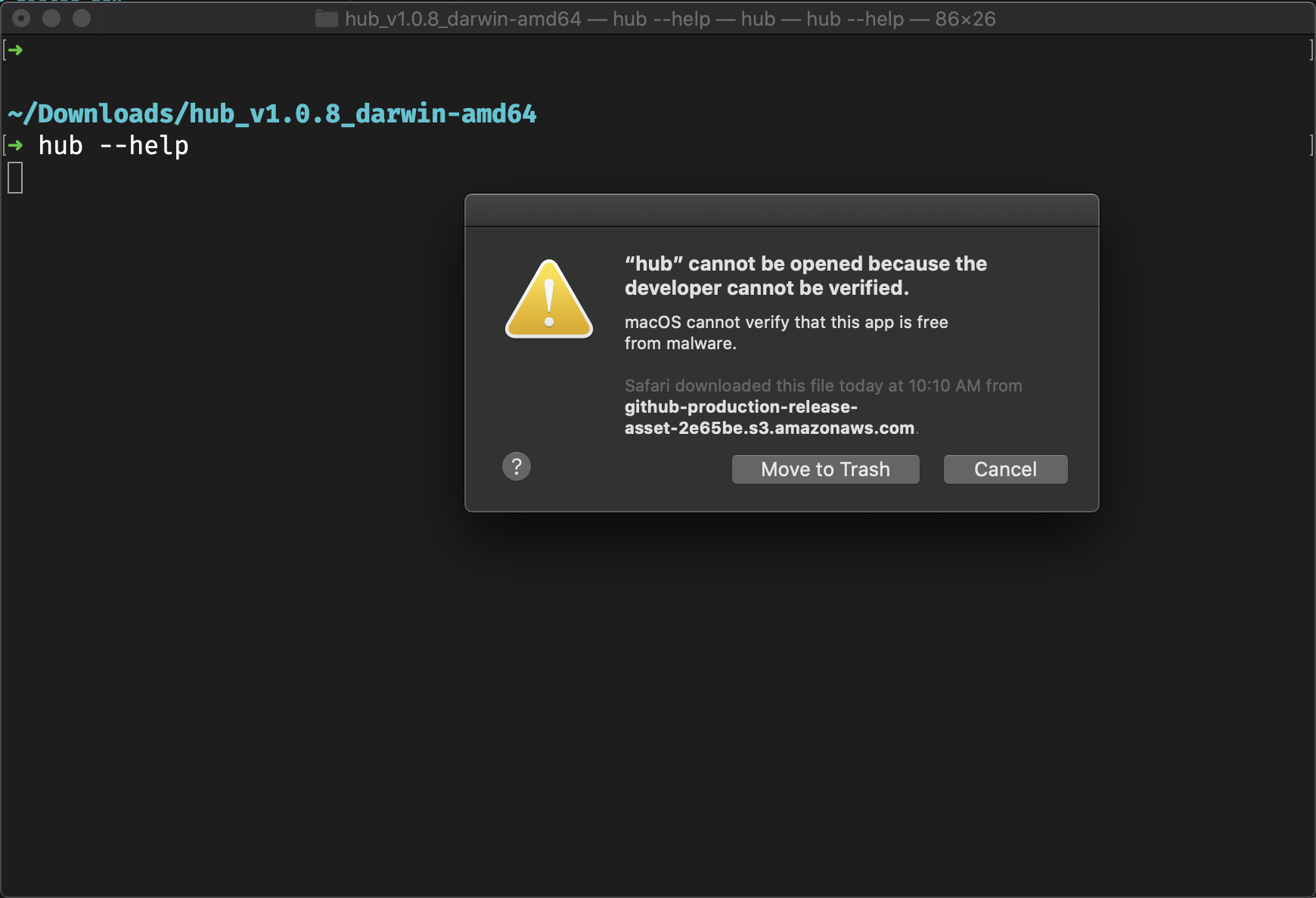 On MacOS you will need to confirm that it is okay to run the hub binary before it will run successfully. Let's fix it now. Run the following,