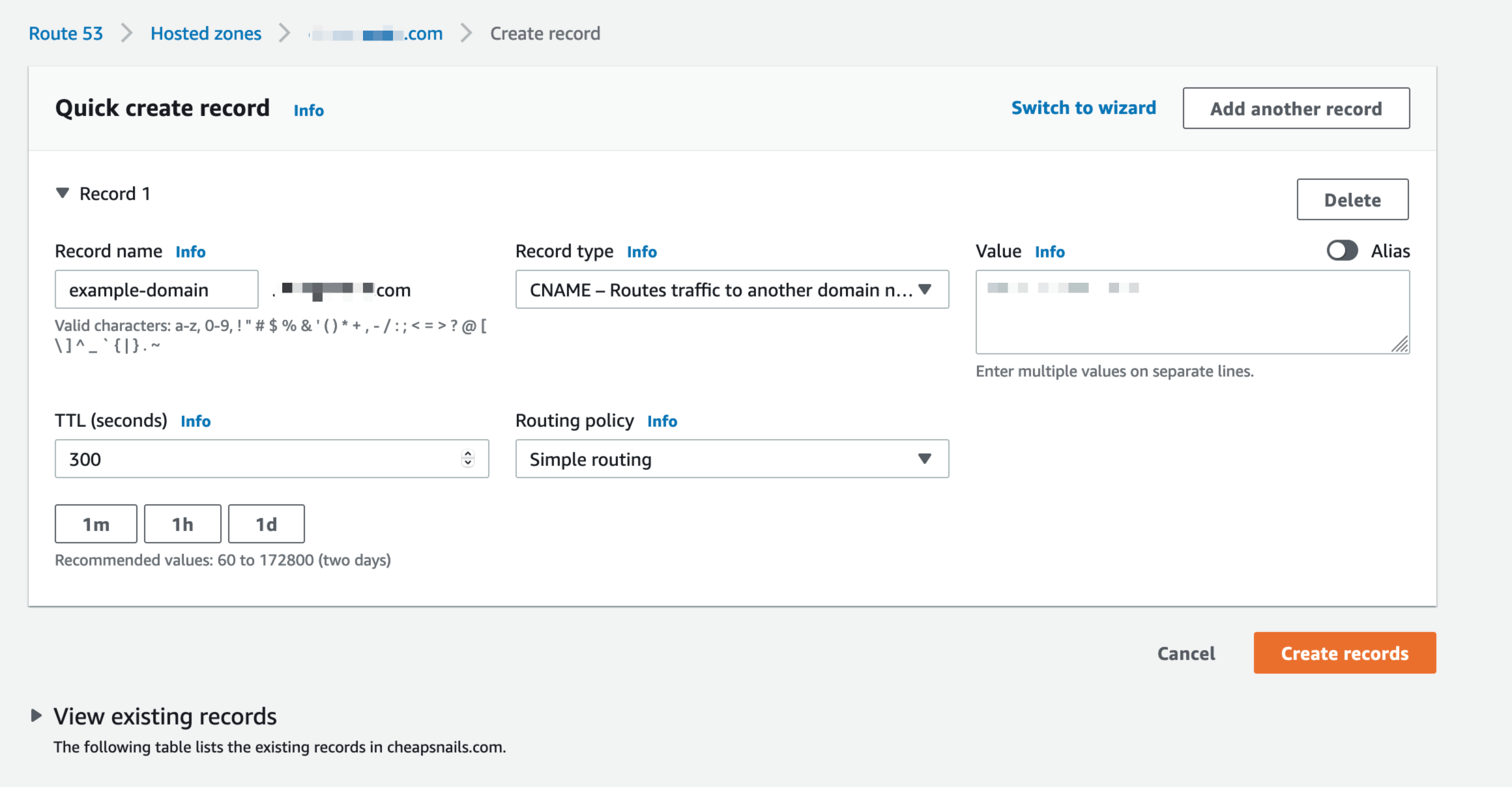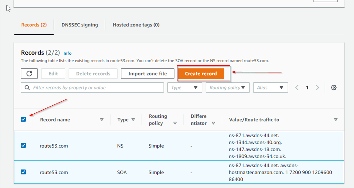 Click Create Hosted zone or select existing one. I’ll go for an existing one this time