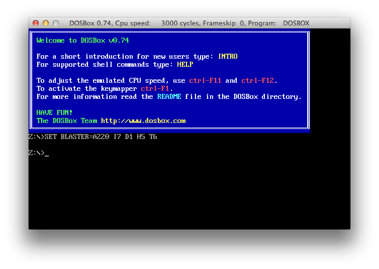 Actually we're not quite done yet: you may notice that you can't move your mouse cursor. I've found that double clicking the blue area of the window makes DOSBox capture your mouse cursor, but if it does not you may need to press CTRL+F10 (CTRL+Fn+F10 if F10 mutes your Mac). Performing this shortcut again releases the mouse as well.
