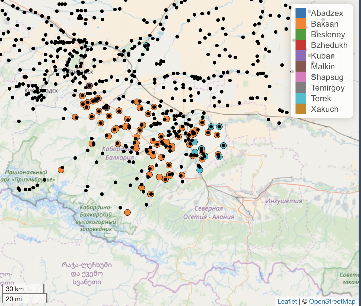 radius = 3, fillOpacity = 1, stroke = 0, color = "black", popup = ~name) %>% setView(44, 43.5, zoom = 8)