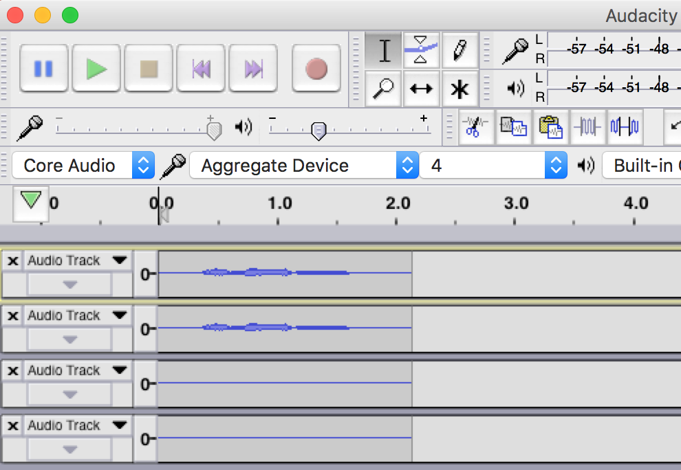 - Record audio. Audacity is a powerful free tool to manipulate audio files and streams. Use it (or similar software) to record a call with your aggregate device as input. The recorded stream will effectively have 4 channels: 2 carrying stereo output from your speakers, and 2 carrying stereo input from your microphone.