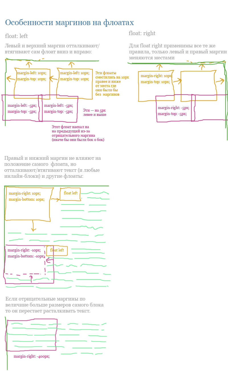 На флоатах можно задавать маргины с 4 сторон, в том числе отрицательные. Некоторые маргины отталкивают/втягивают сам флоат, а некоторые - отталкивают/втягивают окружающий его текст и элементы. На картинке я попытался это отобразить.