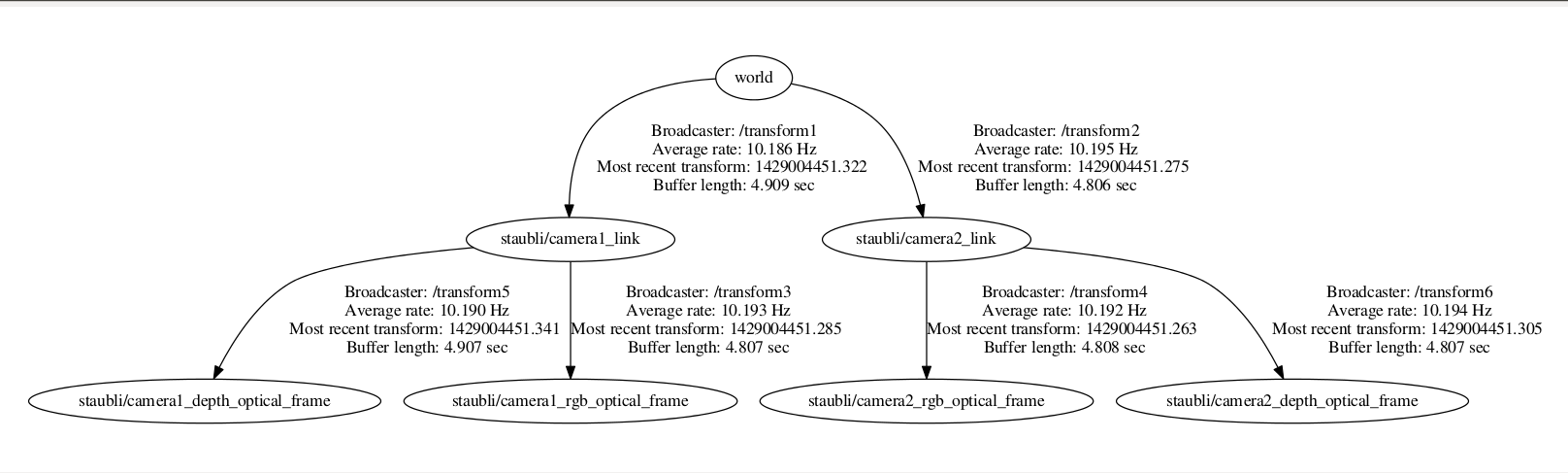 To obtain merged point cloud from two cameras we need to publish tf tree shown on Figure 2. As a result of extrinsic calibration we obtained transformation of RGB (staubli/cameraN_rgb_optical_frame) and Depth (staubli/cameraN_depth_optical_frame) frames with respect to the world. From Kinect2Kinect calibration we know transformation of each RGB frame with respect to the fixed world frame. Finally, we need to combine that in a united tf tree. Here, cameraN_link is fixed frame of an individual camera.