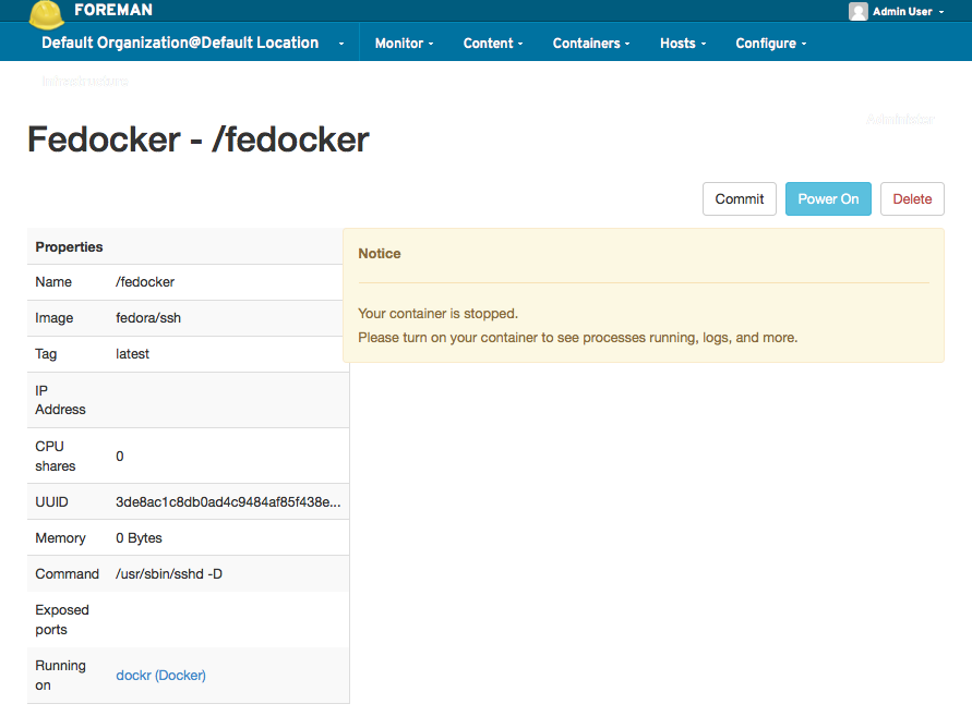 - Create a new "Docker" Compute Resource and use "http://localhost:2375" for its URL