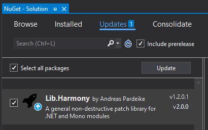 and there, choose Updates [1], select the checkbox at the Lib.Harmony row and choose Update: