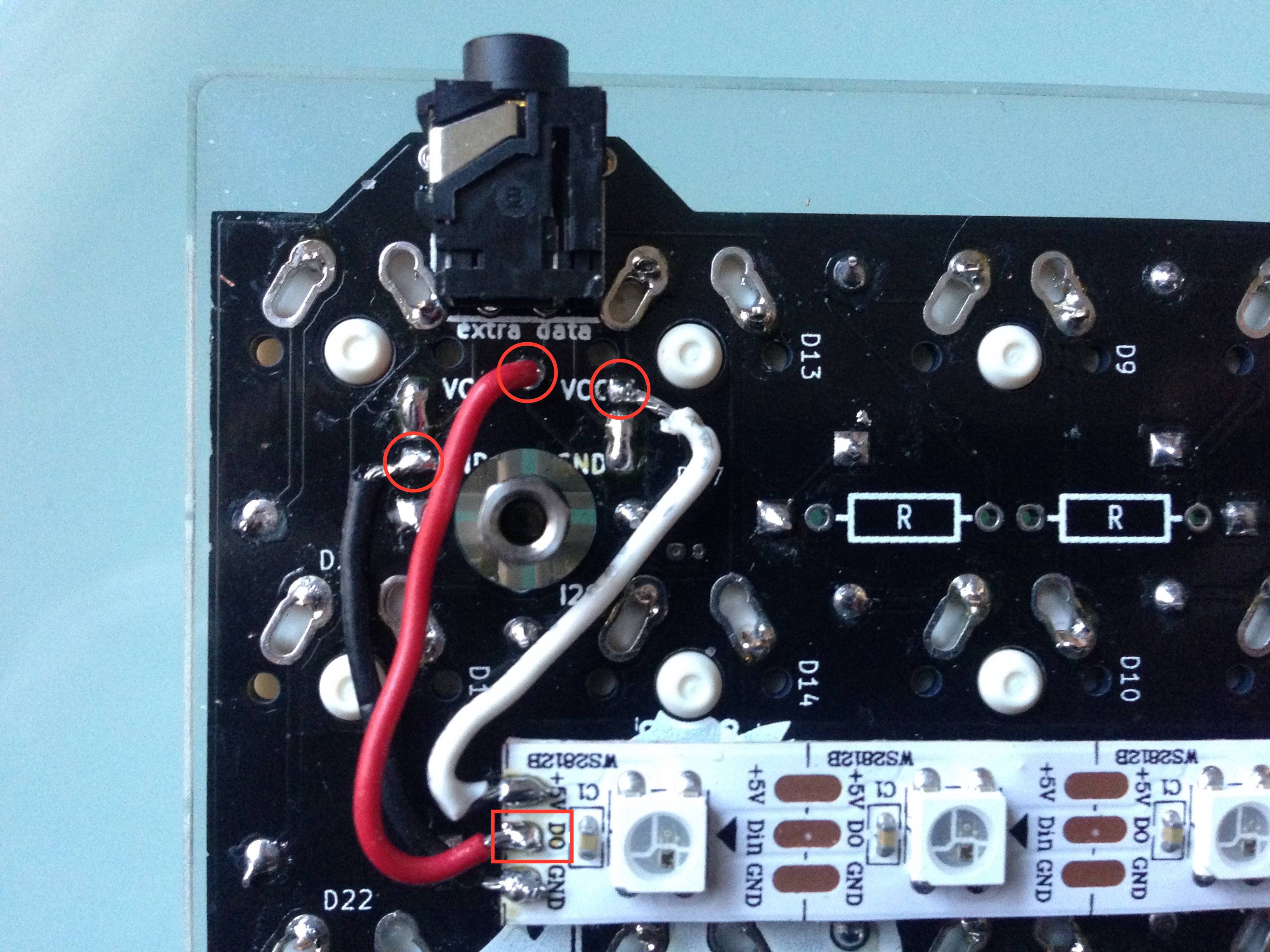 Right below the TRRS jack you'll see two sets of 3 pads labelled VCC and GND. Jumper them like this: