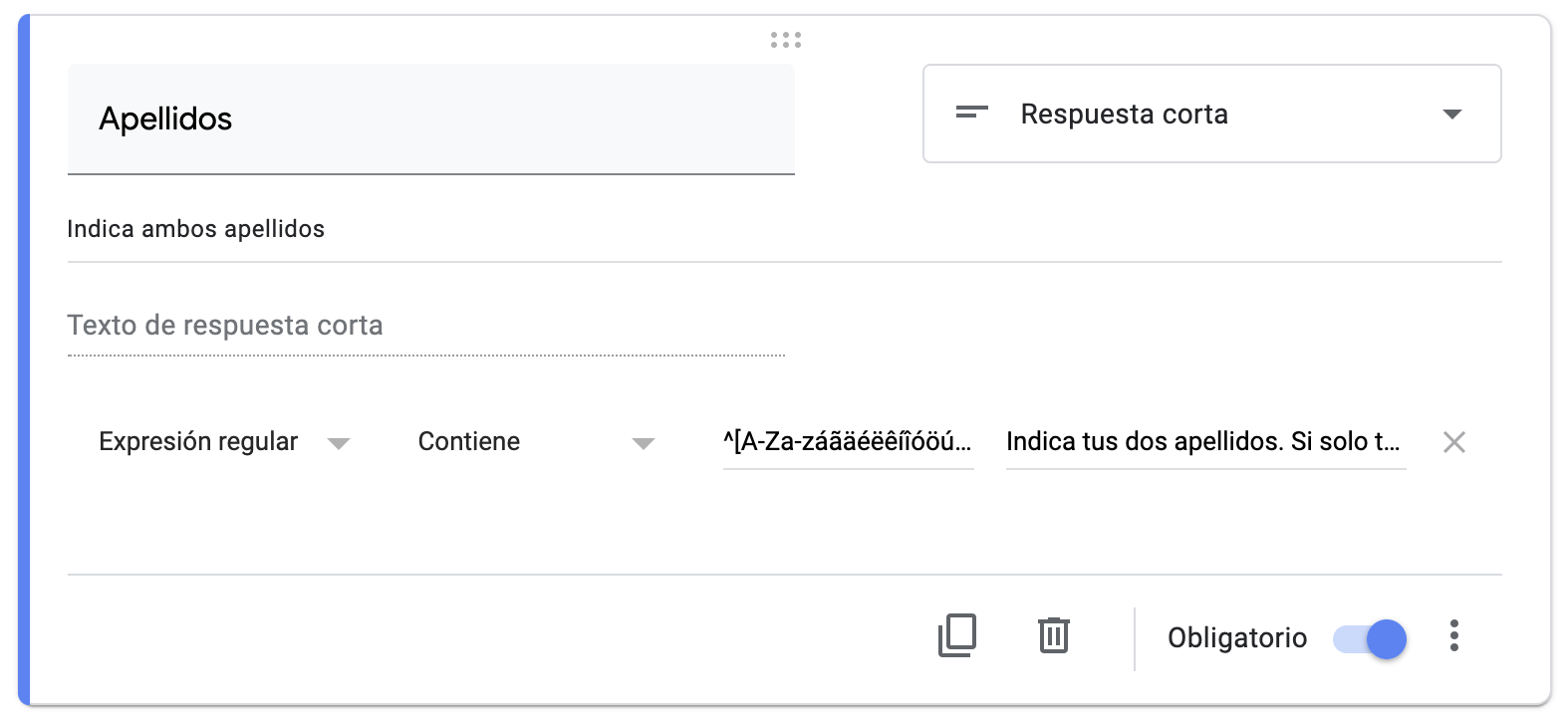 Para usarlas en un Google Form activa la Validación de Respuestas en el menú de 3 puntos al final de la pregunta que estás creando.