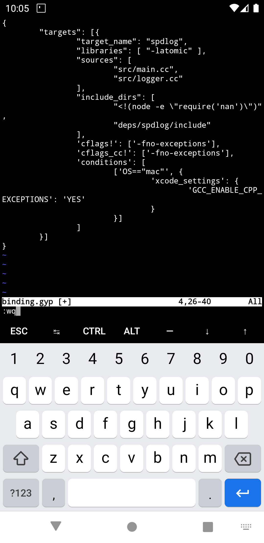 binding.gypand enter edit mode. You can do this by pressingionce you open the file using Vim:$ vim binding.gyp