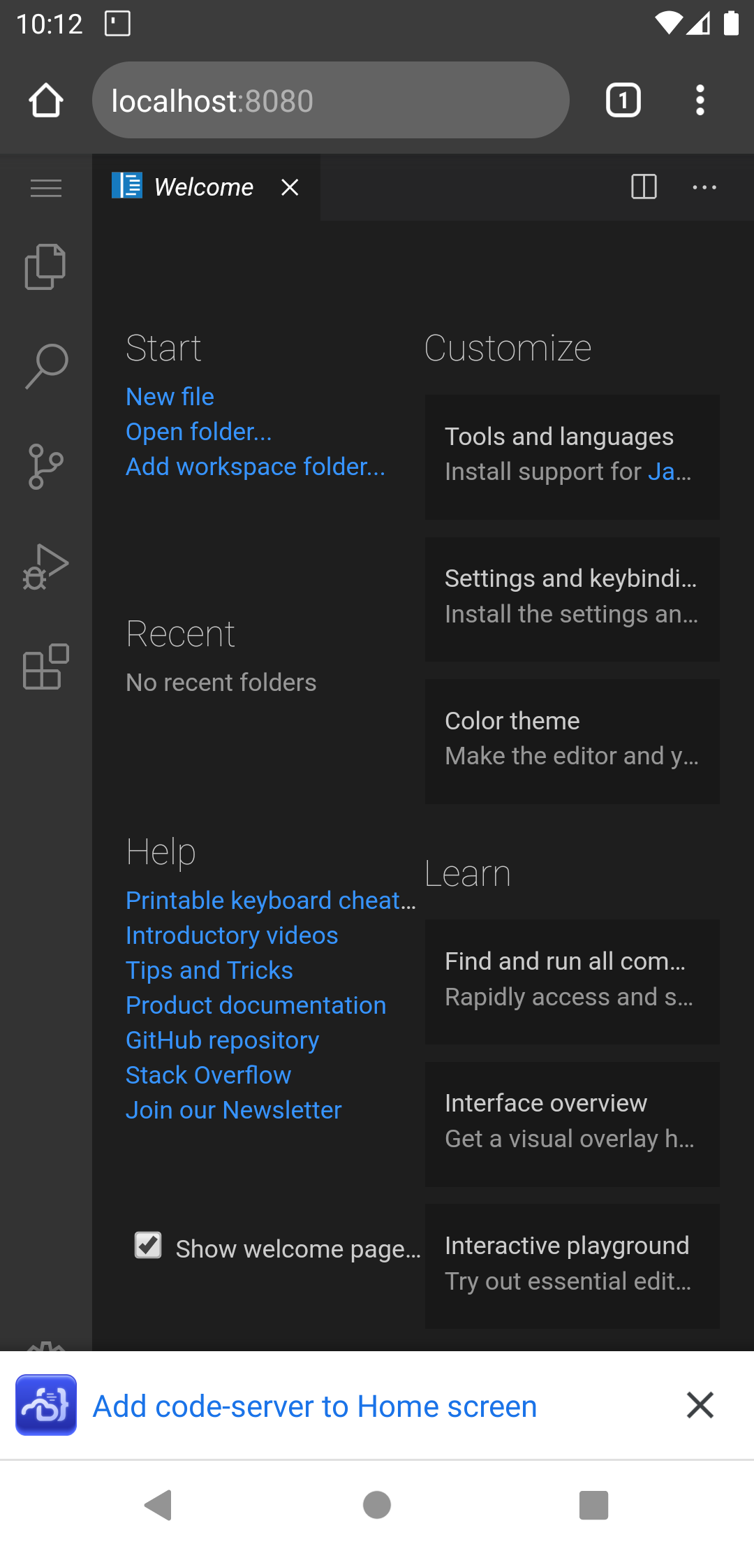 Now, you can open your browser and visit code-server at http://localhost:8080.