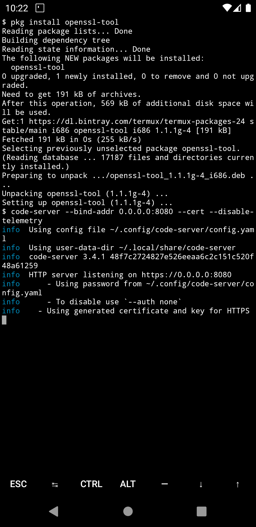 openssl-tooland let code-server generate a certificate on startup:$ pkg install openssl-tool $ code-server --bind-addr 0.0.0.0:8080 --cert --disable-telemetry