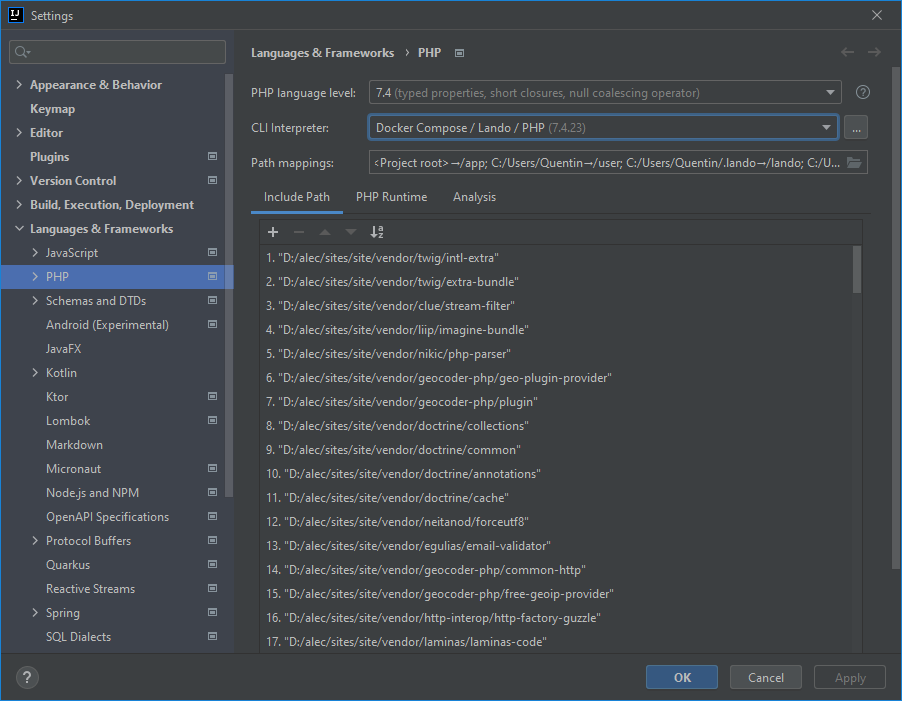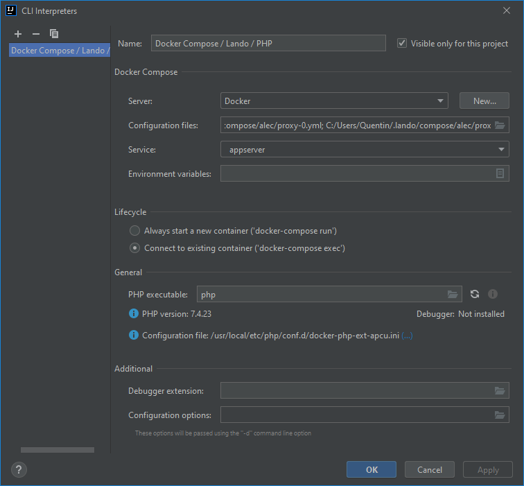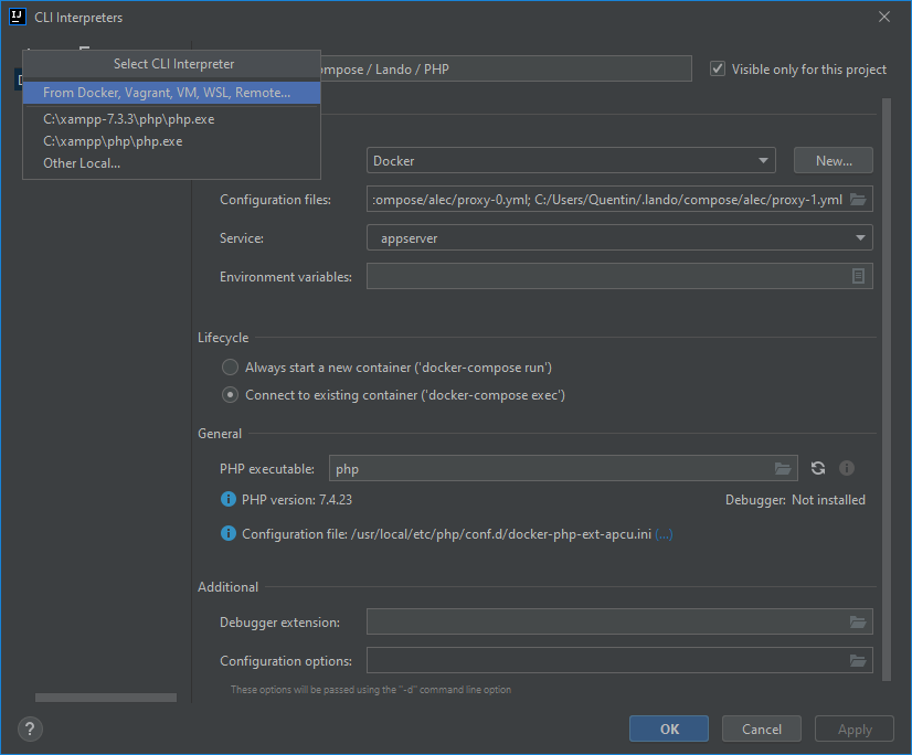 C:\Users\[user]\.lando\compose\[project] - Select "appserver" in the Service dropdown