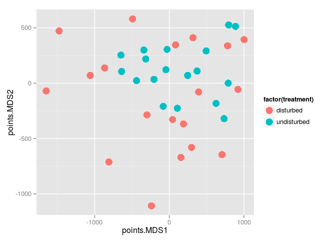 ggplot(.,aes(x=points.MDS1,y=points.MDS2)) + geom_point(aes(color=factor(treatment)),size=5) #make a ggplot