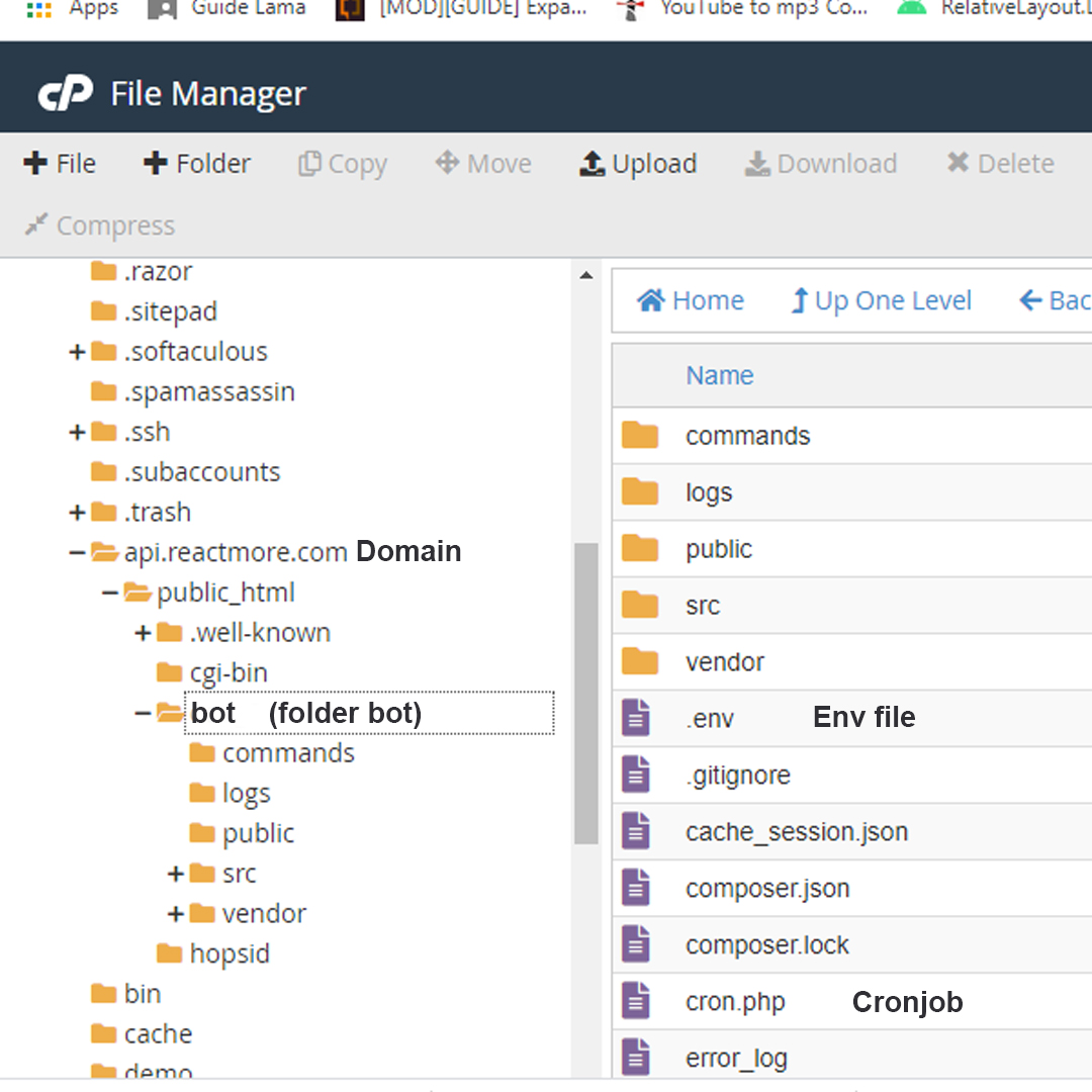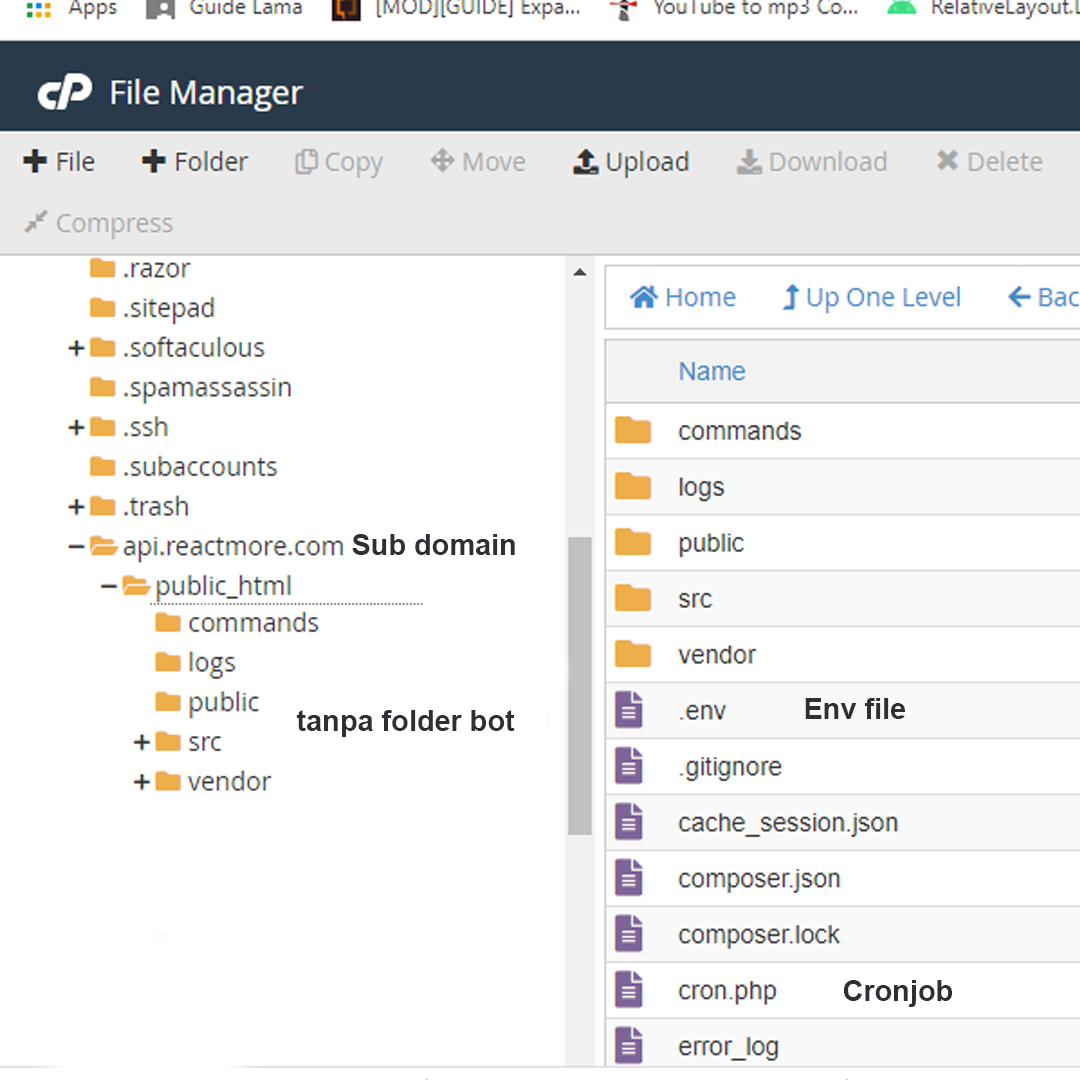 - Opsional Silahkan Rename Folder bot jika di taro di root folder domain atau keluarkan dari folder file nya jika menggunakan sub domain (lihat bagian gambar domain utama dan sub domain untuk penampakan nya)