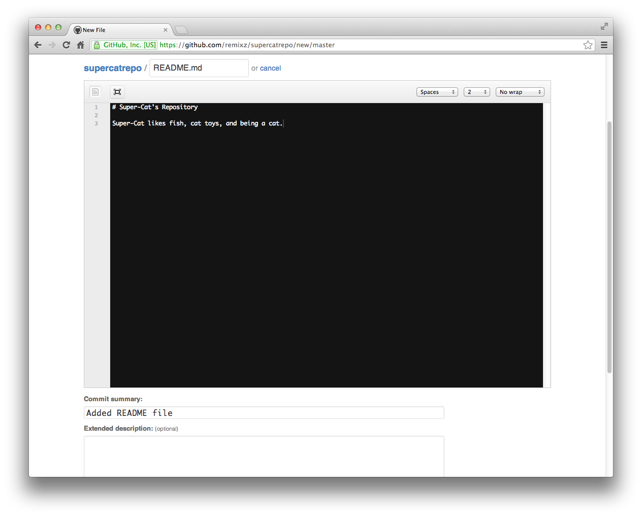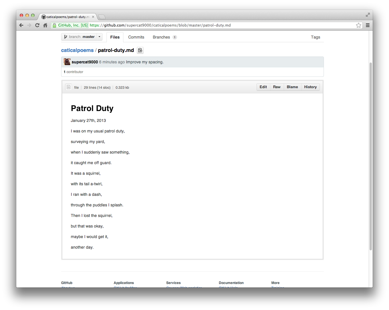 It turns out that along with being a super-cat, supercat9000 is also a poet. Sort of. He can add his own poems to his new repository, caticalpoems. Press the new file button like you did with the fork earlier, and write up something: