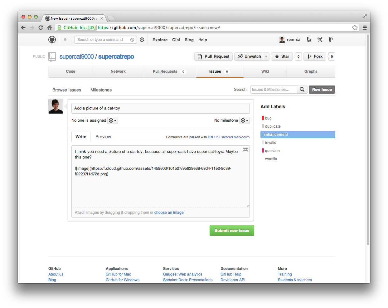 As you can see, I’ve filled out an issue. I’ve added a title, to quickly show what this is about. I also filled out the text, and added an image, which I did by dragging and dropping it in. I finally added a label, to let super-cat know this is an enhancement to his repository. I’ll click Submit new Issue, and I’ve filed the first issue!