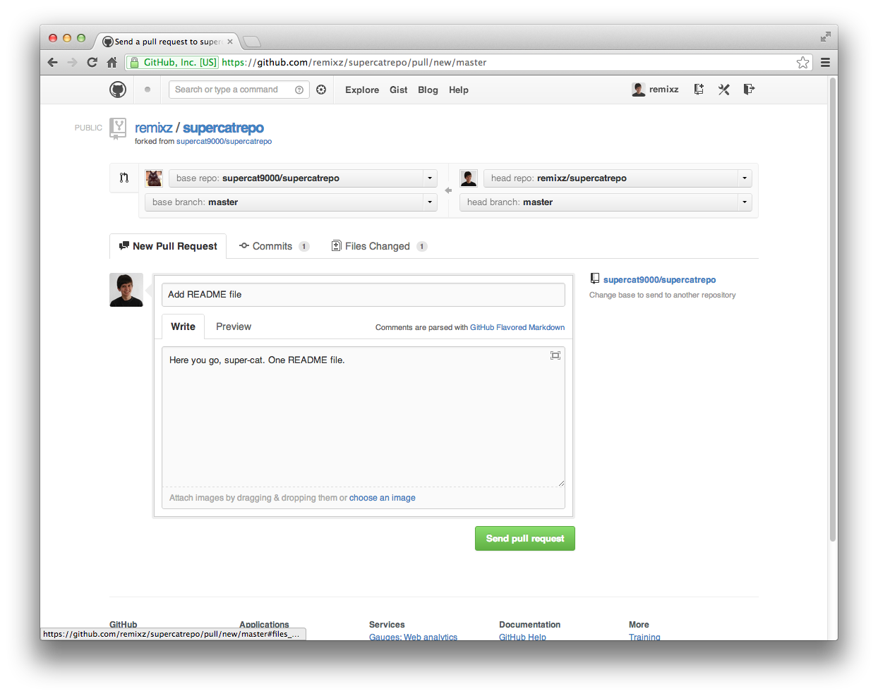 I’ve added a title and a description, to tell super-cat what this pull request is. I will hit Send pull request, and now super-cat can choose to merge it in!
