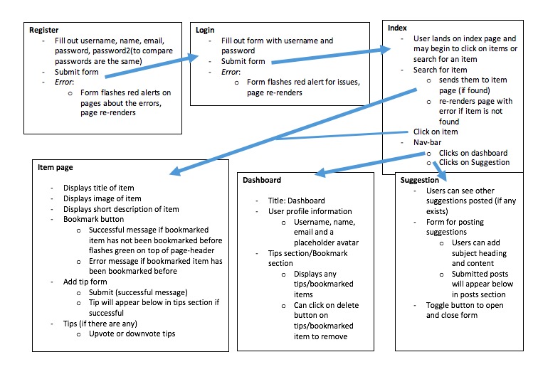 #Description: Multipurpose is an app that provides users access to a database of information on everyday, natural household items so they can find multipurpose uses for those items in order to reduce waste. #User Stories: ##As a user, I should be able to… * sign up to access the app * login to the app * search for everyday household items from a database * click on a household item and get more information about the item * read/contribute tips about the household item * rate others' tips * edit/delete one’s own tip * reset a password * bookmark a household item to be saved in profile dashboard * give suggestions in suggestion forum to add new items to database * report inappropriate tips (provide feedback)