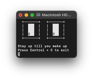 Once executed, stayup will keep your Mac awake while you enjoy the animated ASCII eyes. The synchronized eyes will randomly change their gaze direction and blink at intervals, while the messages at the bottom remind you to stay awake and how to exit.