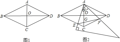 - (12济南) 如图2,在菱形ABCD中,AC=2,BD=$2\sqrt{3}$,AC,BD相交于点O.将一个足够大的直角三角板60°角的顶点放在菱形ABCD的顶点A处,绕点A左右旋转,其中三角板60°角的两边分别与边BC,CD相交于点E,F,连接EF与AC相交于点G.旋转过程中,当点E为边BC的四等分点时(BE>CE),CG=___. [3/8]