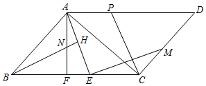 - (19重庆) 如图,在平行四边形ABCD中,点E在边BC上,连结AE,EM⊥AE,垂足为E,交CD于点M,AF⊥BC,垂足为F,BH⊥AE,垂足为H,交AF于点N,点P是AD上一点,连接CP.若DP=2AP=4,CP=$\sqrt{17}$,CD=5,则△ACD的面积为___. [12]