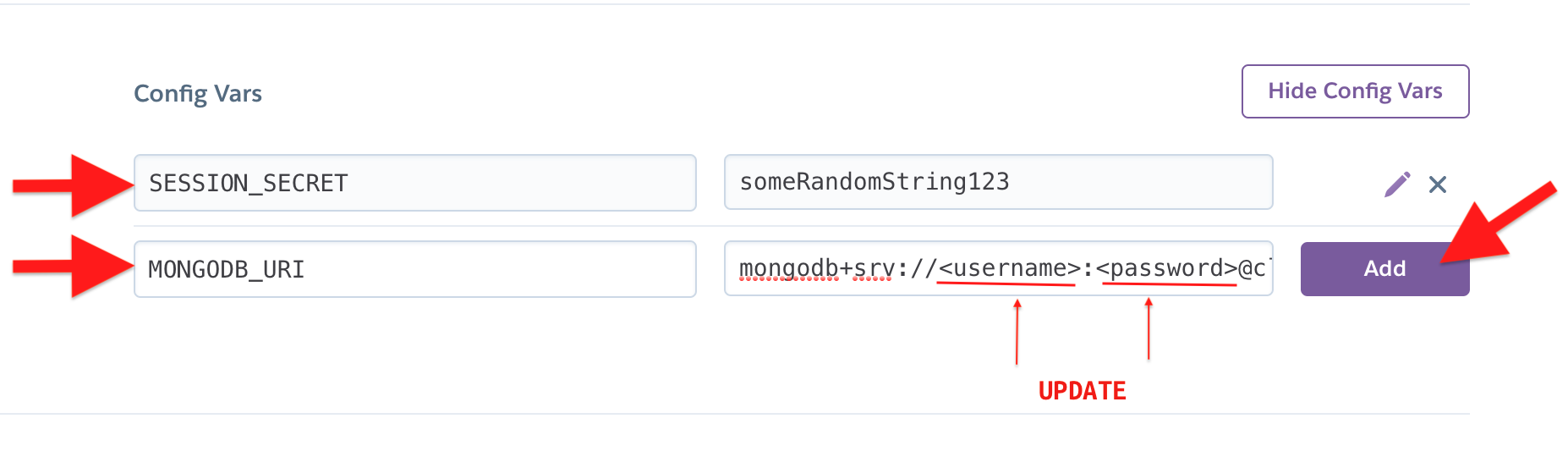 MONGODB_URI=<Mongo Atlas Conection String with username and password>❗ Double-check that all needed config variables (MONGODB_URI, SESSION_SECRET, etc.) were added properly during the previous step :