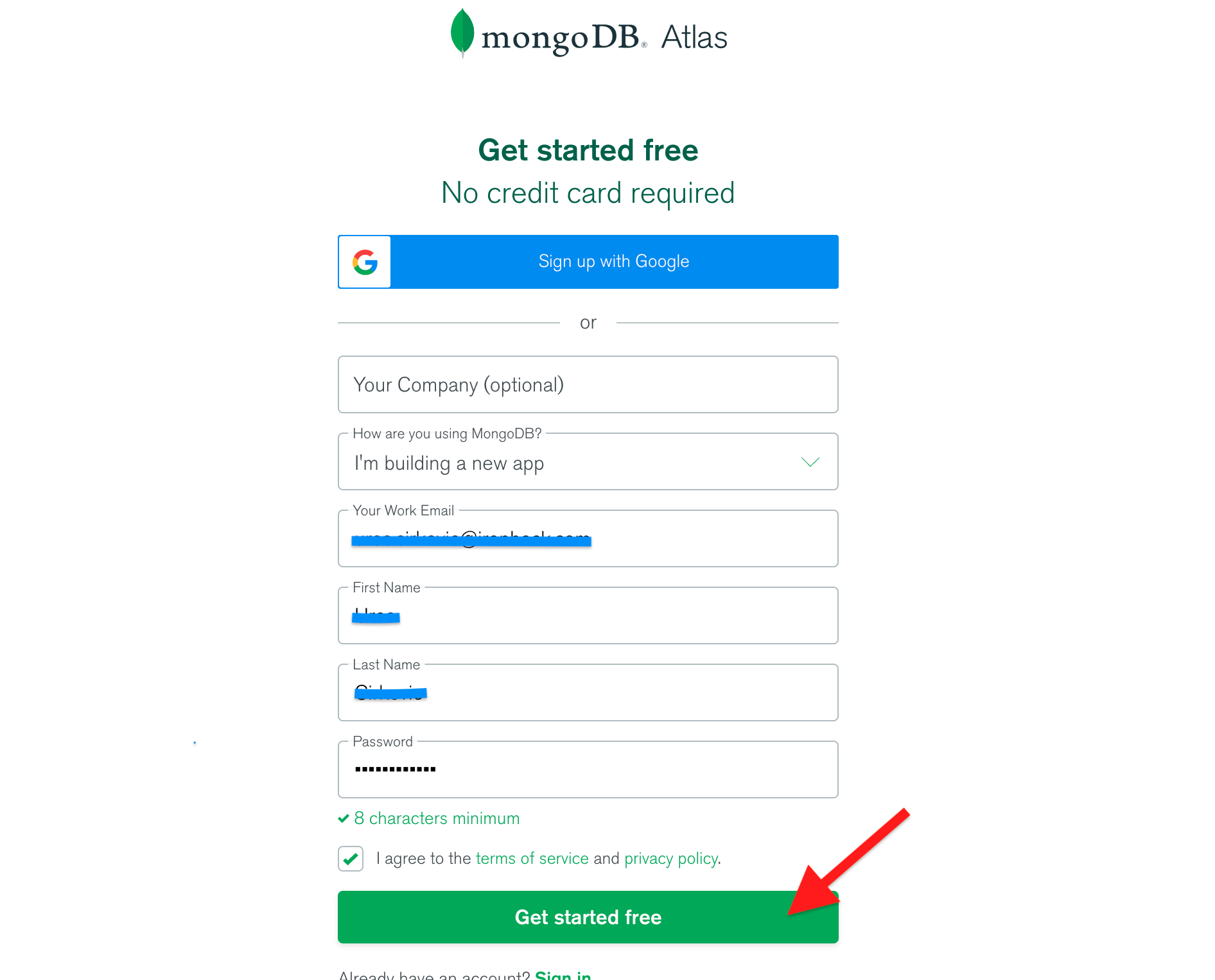 Sign Up for Mongo Atlas - enter the email, password, first name, last name