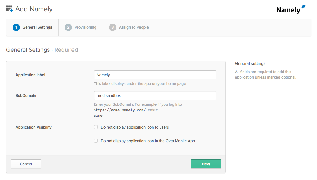 Configure your Provisioning settings for the Namely/Okta SCIM Integration as follows: