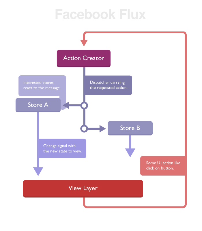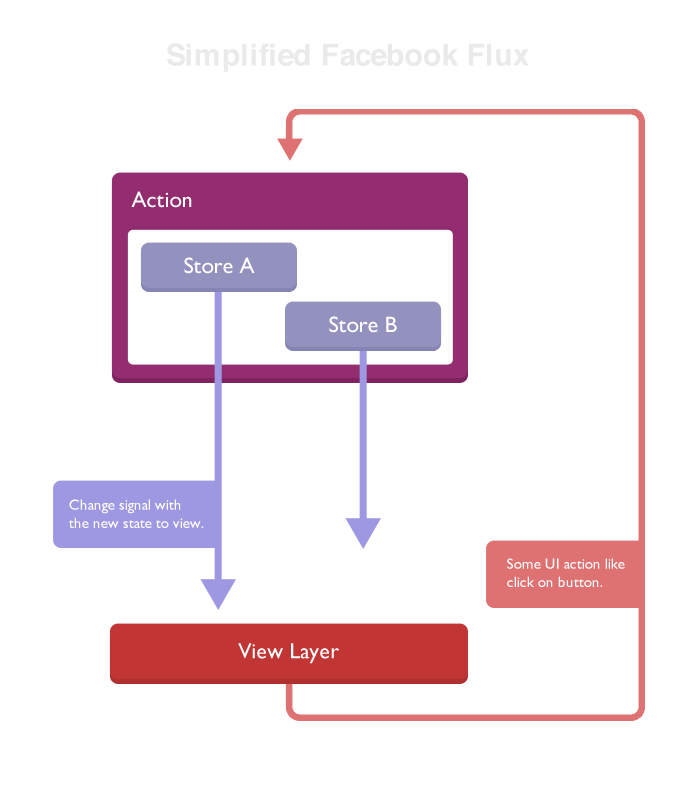###View layer The view layer we keep like Facebook's Flux suggests, it presents the current store's state and if the user interacts with it the view invokes an action on the "actions layer".