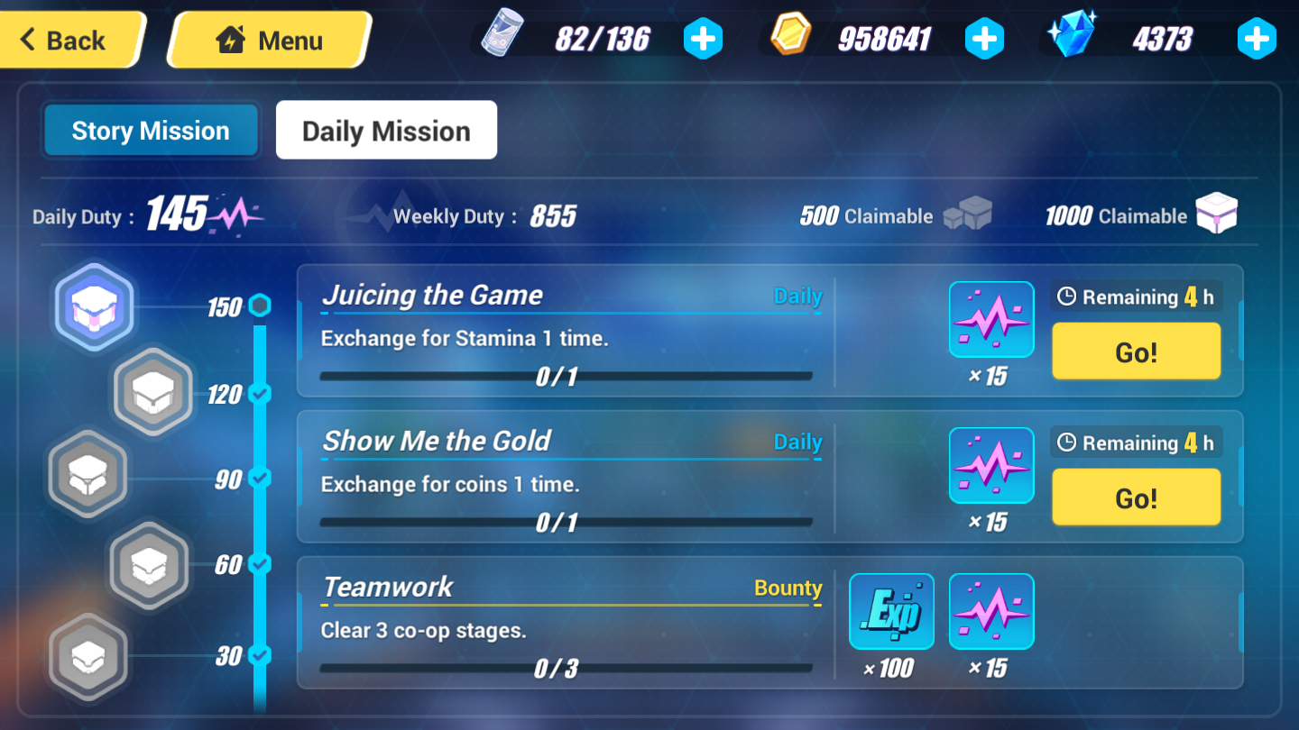 So as you may know already, there're 2 biggest currencies in the game: coin and crystals. Obviously crystals is more important so you'll need to farm them as much as you can, while you'll be unlikely to run out of coins at a normal play rate. Your constant source of crystal is gonna be daily missions. It's completely doable that you reach the highest daily mission award every day, totalling 40 crystals per day. This and Abyss clearing, each month, can earn you enough for 1 guaranteed 4-Star Stigmata drop in Focused Supply (which costs 2800 crystals). On top of that, doing daily missions helps you level up very quickly, which can unlock a lot of content later on like Samsara / Blood Realm event / etc.