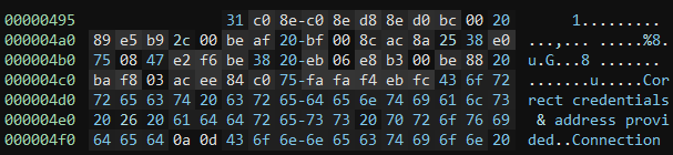 Checking 0x495 in Binary Ninja and using the Transform -> XOR function with 0x41 we get some seemingly random bytes and the string "Correct credentials & address provided Connection "