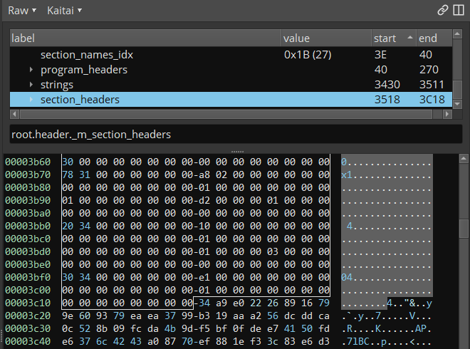 Looking through the code in a disassembler, it very quickly becomes evident the file is a binary for the program sleep from GNU coreutils, specifically the version shipped with FreeBSD. The file is 128KiB in size, though, when the binary from FreeBSD is less than 20KiB. To try and isolate the other data from the sleep binary, I opened the file in Binary Ninja and opened the structural view offered by the excellent Kaitai plugin:
