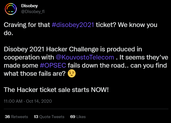Unlike in previous years where the puzzle started on the Disobey website, this puzzle's starting point was this tweet on the official Disobey Twitter, tagging @KouvostoTelecom and hinting that many of the tasks would revolve around OpSec.