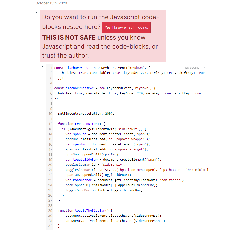 As always, add the code to a Javascript codeblock nested in a {{[[roam/js]]}} block. CSS can be added using a CSS codeblock on the roam/css page.