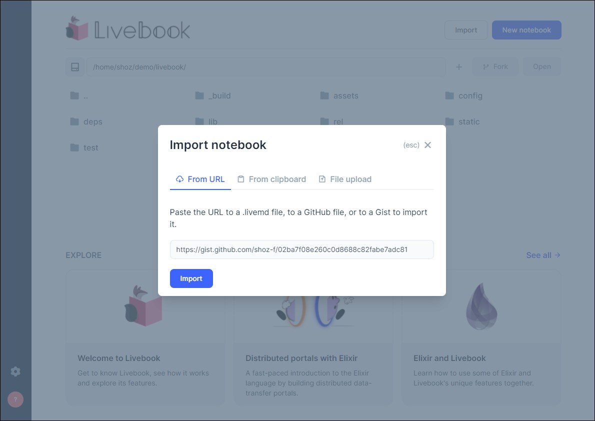 尤も、この記事の中のコードは一度 Livebook上で試しており、コードにこの記事の文章を書き加えた notebookを Gistに保存している。お手軽にそれをインポートして試すこともできる。この場合は、画面右上の[Import]ボタンを押そう。