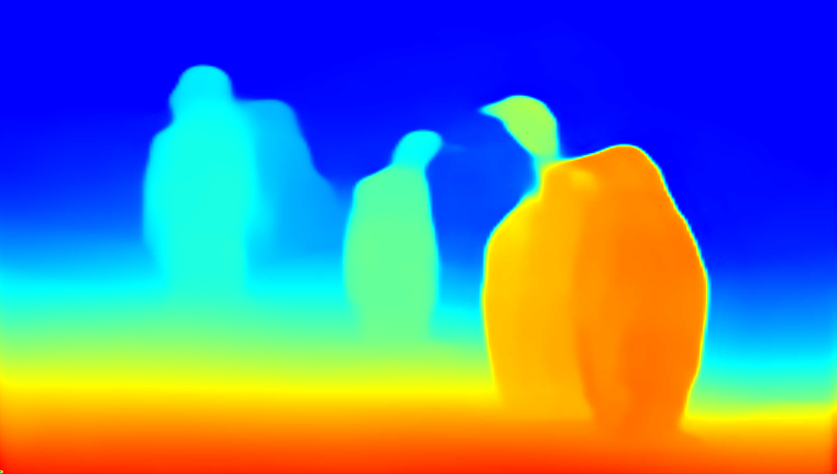 MiDaS深度推定の実行結果は下の様になる。一番手前のペンギンが濃いオレンジで、奥に行くほど青に変わっていくのがわかる。期待通り動作しているようだ。