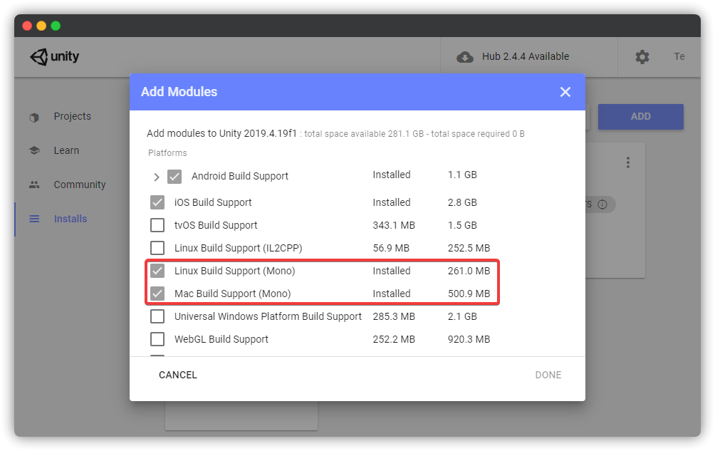 Install the "Build Support (Mono)" module for the platforms you will support (seriously, do it for all of them because it's not harder than pressing 3 more buttons)