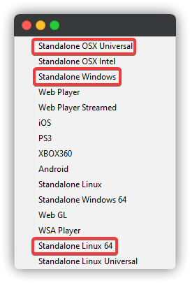 What platforms do you actually want to build for? Preferably, you'd want Standalone OSX Universal, Standalone Linux and Standalone Windows. I was getting issues when trying to compile for Standalone Linux, and i thought that instead of fixing it, because Muck is only compiled for 64-bit systems by Dani, i just chose to compile for Standalone Linux 64 instead. It worked in my testing VM, but you should absolutely not rely on this if Muck ever supports 32-bit in the future. The image below shows the platforms i compile my mods for.