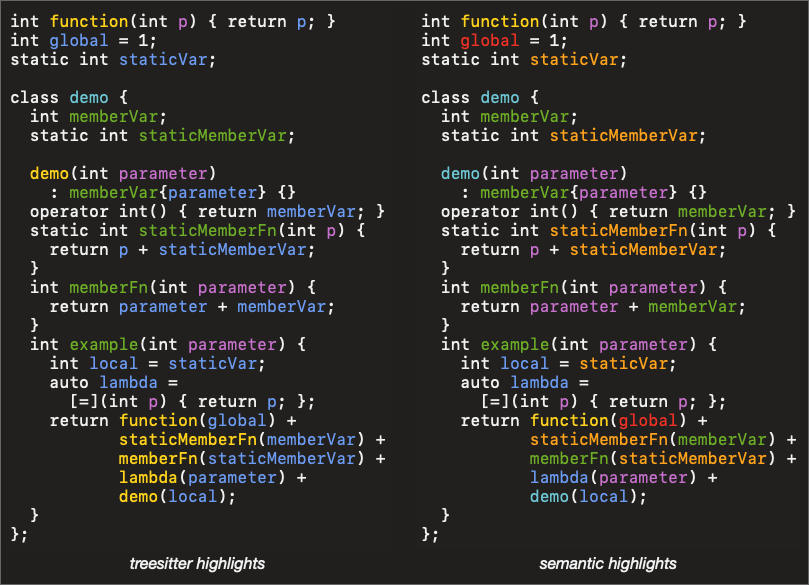 In C++, treesitter will highlight member variable declarations with @property and names in the parameter list as @parameter. But when they are used inside the function body, treesitter can't tell the difference between them, so they are all just blue @variable identifiers. Semantic highlighting uses an LSP (clangd, in this case) to show more accurate highlights.