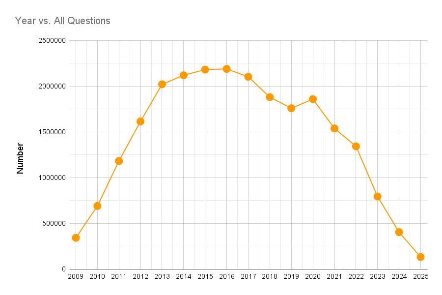 A highly significant trend is the decline observed from 2022 onwards. The volume of questions dropped from approx. 1.86 million in 2020 to projected lows of 130,000 in 2025—a fraction of the peak volume. This decline is inferred to be a direct consequence of the generative AI boom.