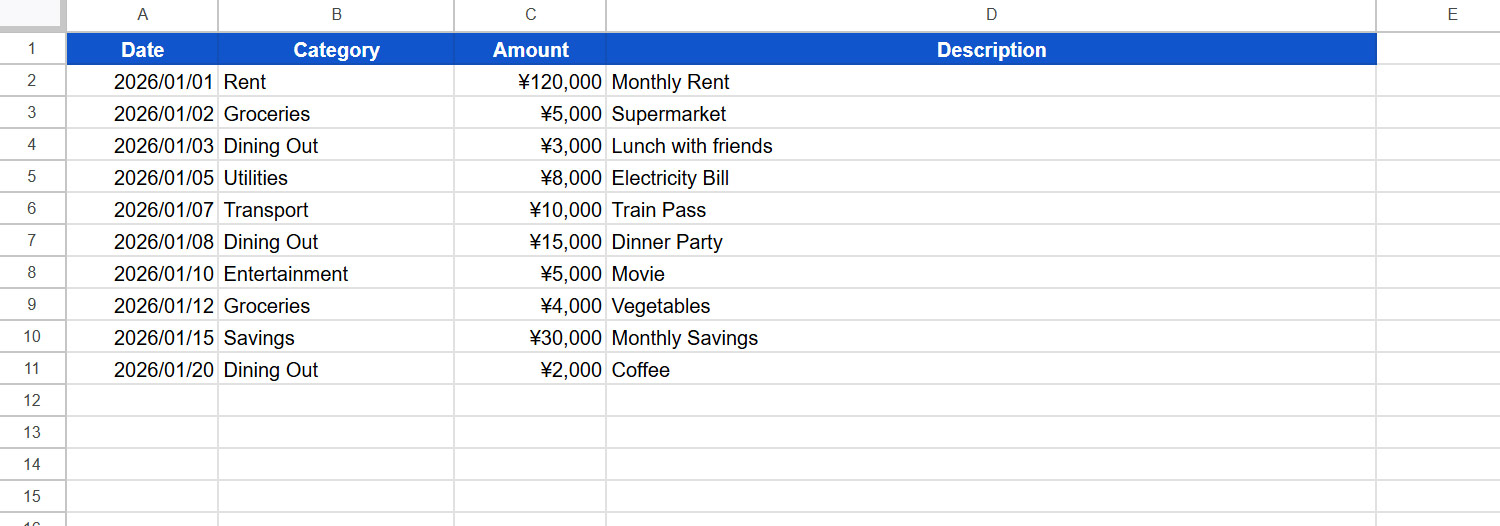 Before running the script, check "Sheet1" in the Google Sheet. You should see the following table:
