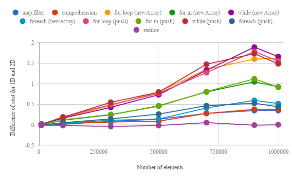 push()andnew Array()is almost the same. - When the array is changed from 1 dimensional array to 2 dimensional array, the increasing ratio of the cost for "Comprehension", "forEach" and "map, filter" is much lower than that for "for in", "for loop" and "while".