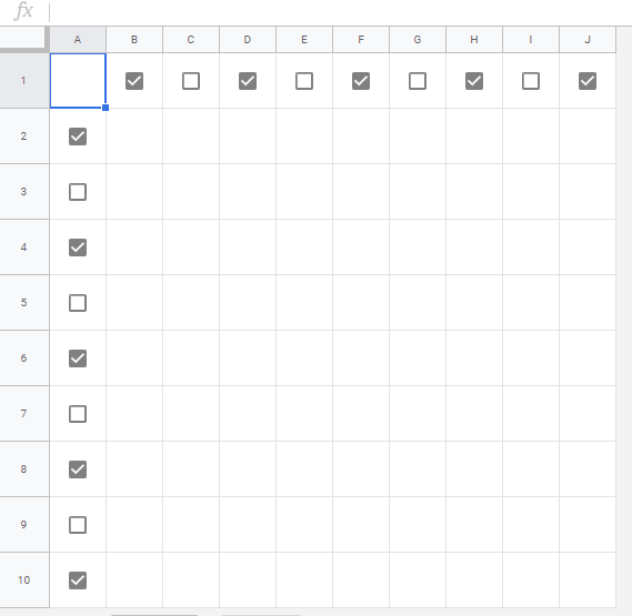 The 1st row and the column "A" are used as the header row and header column, respectively. Each header has the checkboxes. This sample Spreadsheet is used for the following scripts.