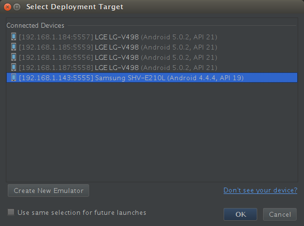 $ adb -s LGV498b9cacc1 connect 192.168.1.185:5559
