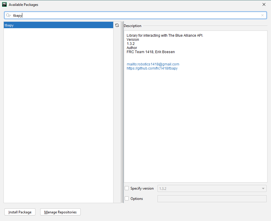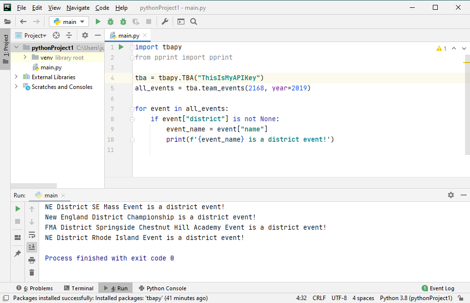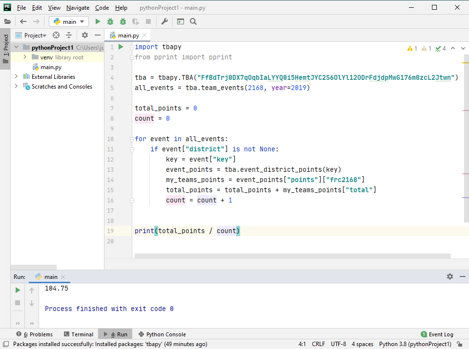 While it's possible to get data from a web API with the Python standard library, it's a lot easier with third-party libraries. My personal favorite and recommended library is tbapy. In order to install it, follow these steps: