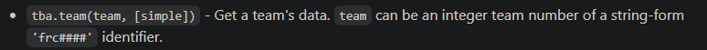 Here, tba.team is exactly what we did in the last script we ran! 2791 (or whichever team you put) is team parameter - you'll note that the tbapy developers noted that you can provide either the team number (2791) or the team key, which would be a string of "frc2791". Team keys are pretty common within the TBA API and the official FRC APIs.