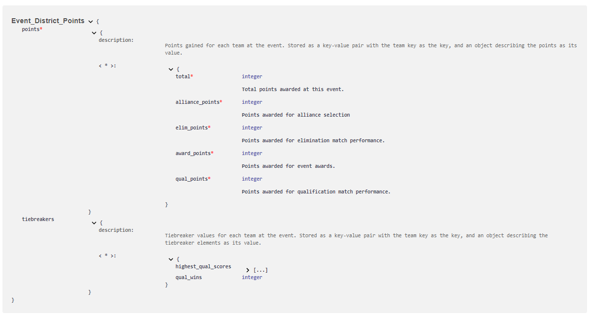 But unfortunately our given event blobs don't include district points information. However, that information is available elsewhere in the API, so we need to make another call to the API. You'll note that the district points data is structured as such: